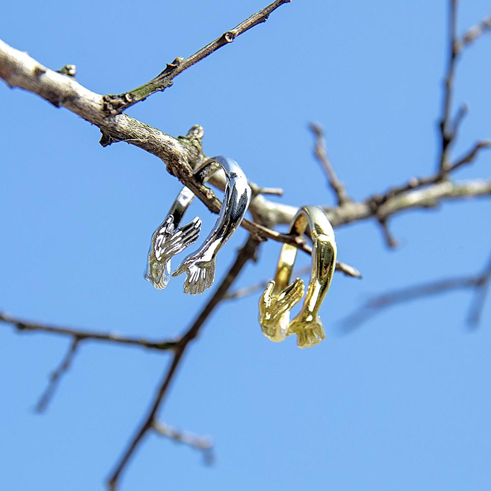 - ‘Hug ring’, designed to look like arms wrapping around your finger. A super-sweet ring with two little hands meeting in a firm hug. This ring has a very meaningful shape; it has no beginning and no end, the symbol of eternity. Wear this ring to empower yourself and as a reminder of the never-ending love of the people in your life. Gift someone you love this lovely ring to send them a hug that they can wear every day!