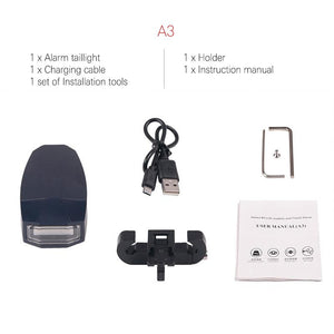A3: 1 x Alarm taillight, 1 x Charging cable, 1 set of Installation tools, 1 x Holder, 1 x Instruction manual
