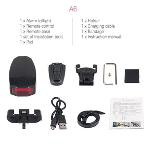 A6: 1 x Alarm taillight, 1 x Holder, 1 x Remote control, 1 x Remote base, 1 x Pad, 1 x Charging cable, 1 x Bandage, 1 set of Installation tools, 1 x Instruction manual