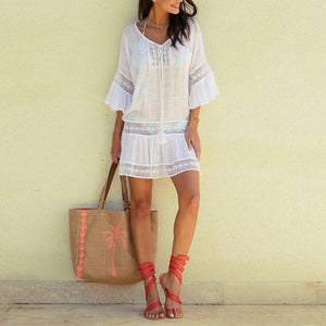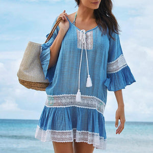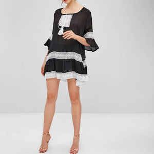 The Lace Panel Tunic Dress features a shift silhouette with a scoop collarline and lace panels. For timeless femininity, try it with open-toe sandals and a clutch bag.