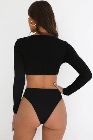 Seductive one piece bathing suit in solid color, details include plunged v neckline with pad cups, long sleeves, cutout trim on each waist side, and high cut leg thong bottom. Designed in stretch nylon and spandex.