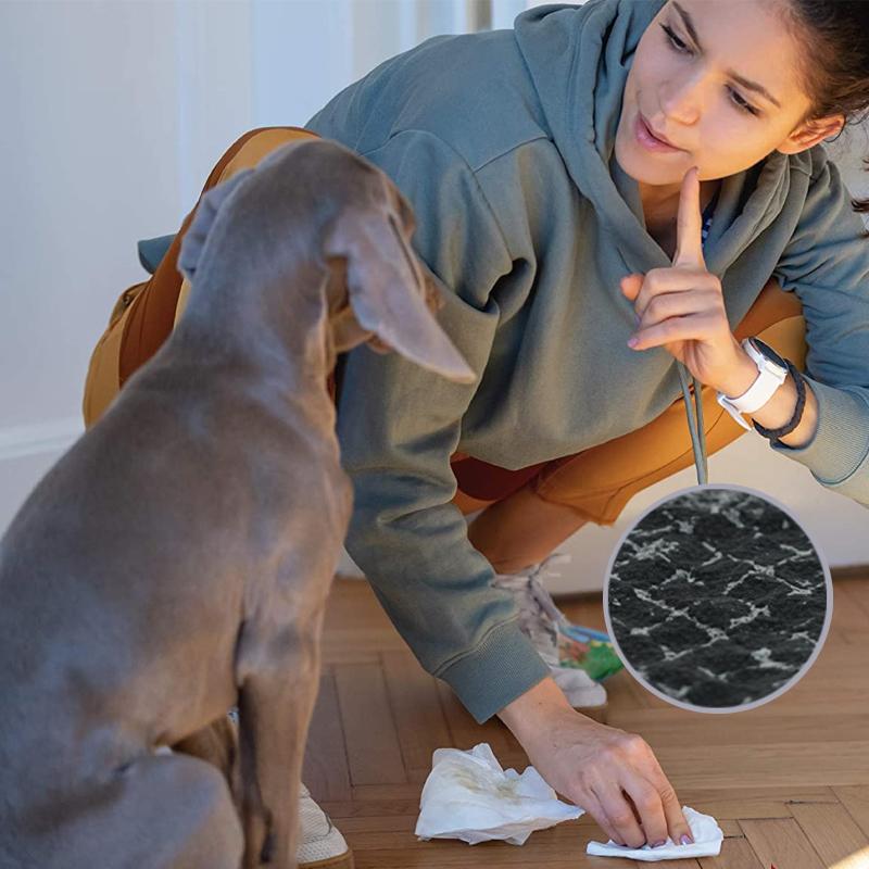 • BLACK potty pads, so your pet’s mess stays discrete and you never see a yellow stain on a white puppy pad in your home