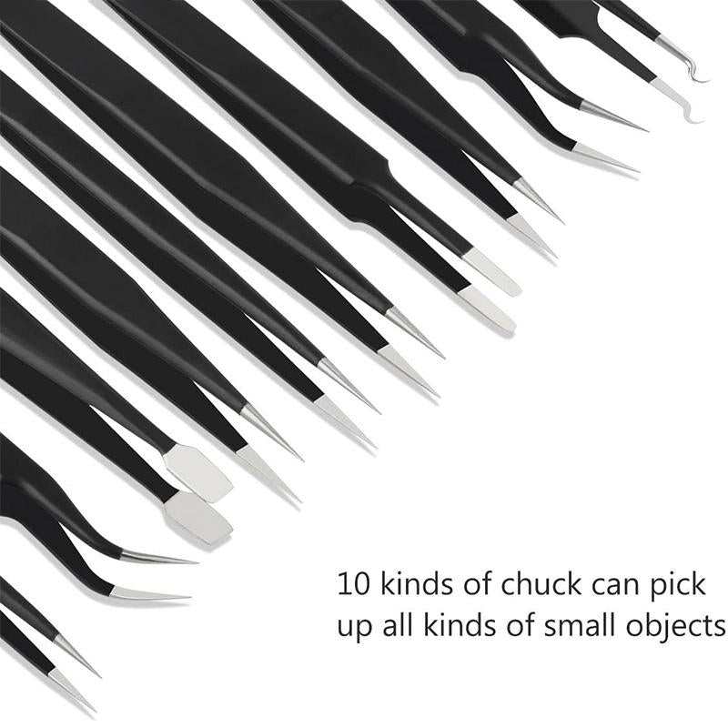 This 10 in 1 precision tweezer kit includes different types of tweezers with different tips, extra-fine pointed tweezers, angled tweezers, flat tip tweezers, meet your different perspectives.