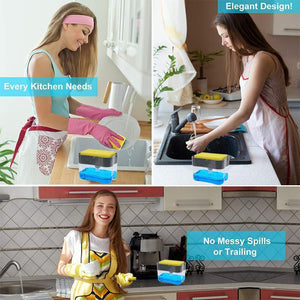 INSTANT 2 IN 1 DISPENSER + CADDY, ONE HAND OPERATION, COMPACT ORGANIZATION: Sink dispenser with attached caddy holds sponges, scrubbers, rags, scouring pads in one convenient place while keeping water off of kitchen counters. NO Messy Spills, Dripping or Trailing.