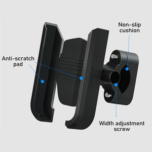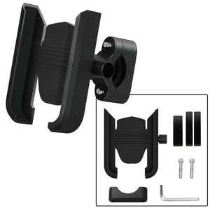 HANDLEBAR COMPATIBILITY- Adjustable bracket for handlebar sizes from 3/4 "to 1-3 / 4" in diameter. The aluminum phone holder is designed for strength sports and holds the phone firmly in place. It can be mounted on the handlebar and fits almost any vehicle on the market, such as a motorcycle, mountain bike, e-bike, folding bike, scooter, etc.